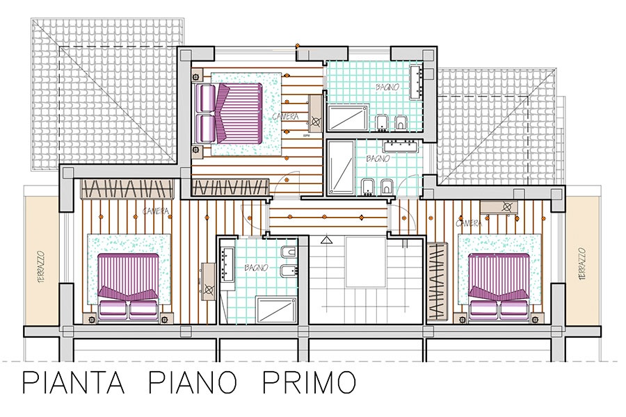 Al piano superiore si trovano tre camere da letto matrimoniali tutte con bagno, due delle quali anche con terrazza.